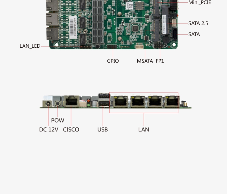 | Fan interface | Fan less cooling design, reserved 1*4pin CPU fan port, 1*4pin system fan port |