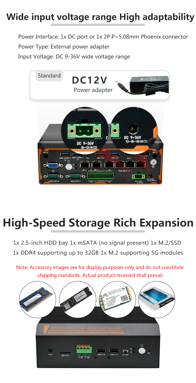 Power Interface | 1x 2P (P=5.08mm) Phoenix connector, supporting DC 9~36V wide-range power input | |